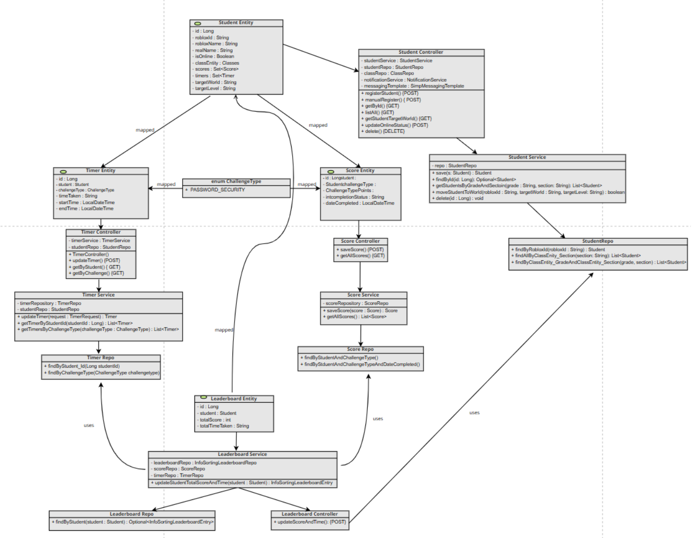- DTOs: Handle structured input and output between the backend and the Roblox client or teacher dashboard, ensuring clean data transfer without exposing internal entity models.