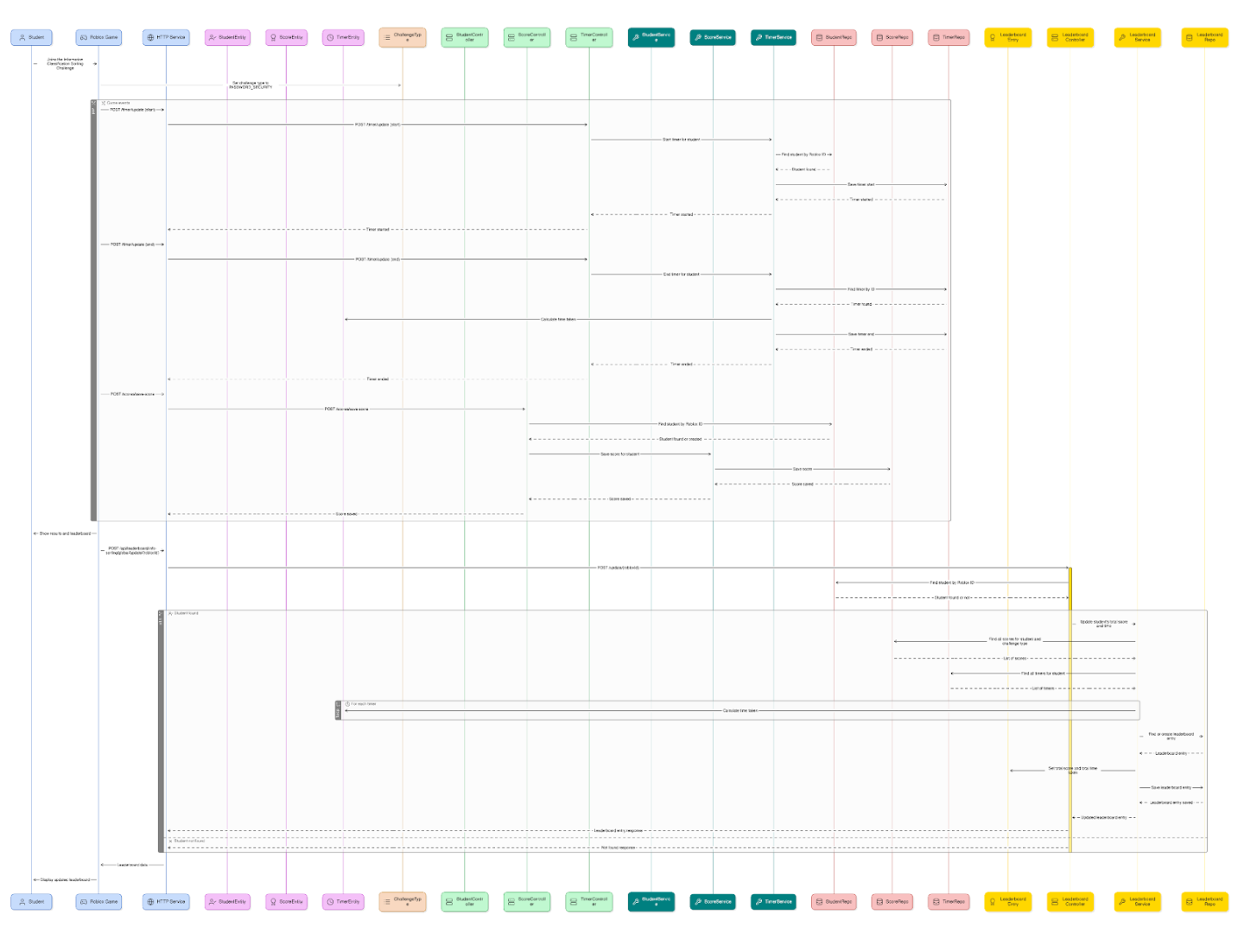 - Services: Contain the business logic for student management, scoring, timing, scenario validation, and leaderboard computation while keeping controllers lightweight and modular.