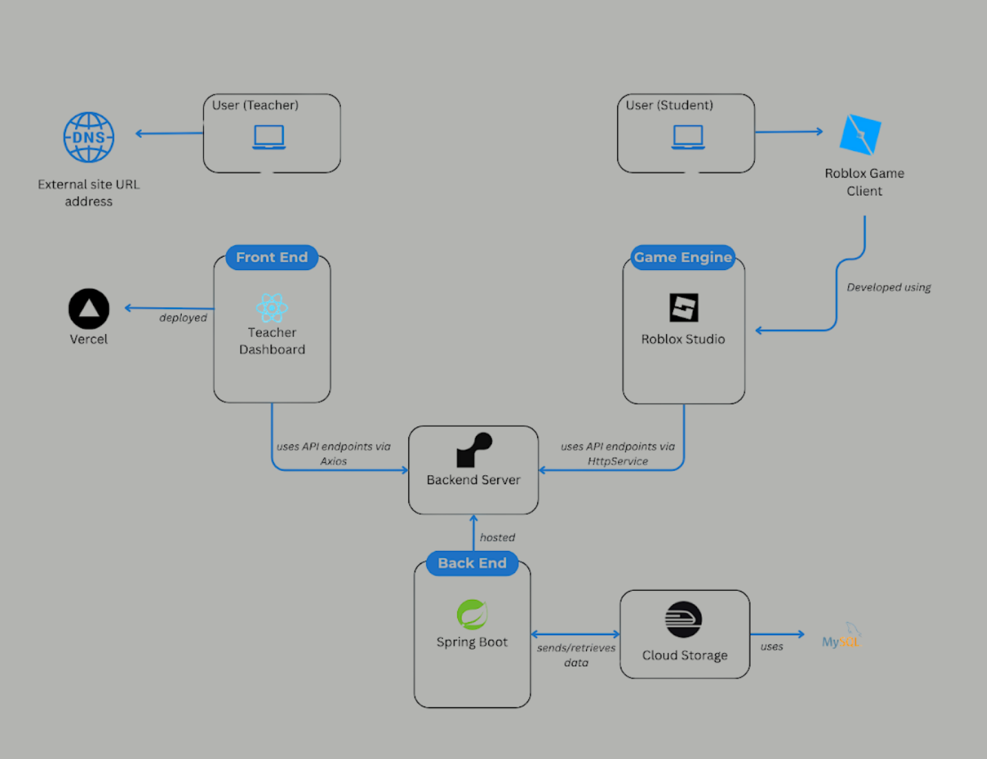 - Response to Client: After processing, the Service returns the result to the Controller, which then sends a structured JSON response back to the Roblox client or teacher dashboard.